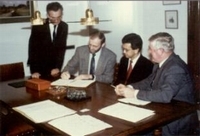Het tekenen van de akte. V.l.n.r. Notaris R.J.W.J. Meyer, H.Zeldenrijk, L.H.F.Welter, A.Doets.